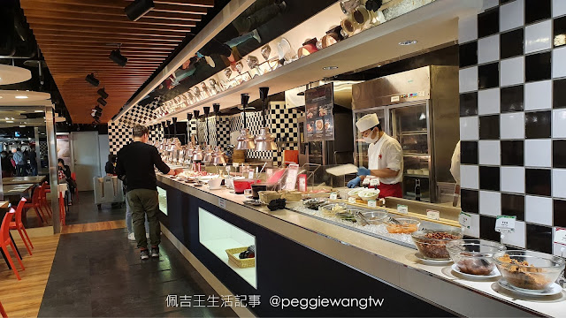 餐廳分為兩區,入口往左走為冷食區和往右走為熱食區。晚餐期間兩區都有豐盛餐點,尤其是冷食區有早餐沒有的甜點與生魚片、日料、海鮮等。