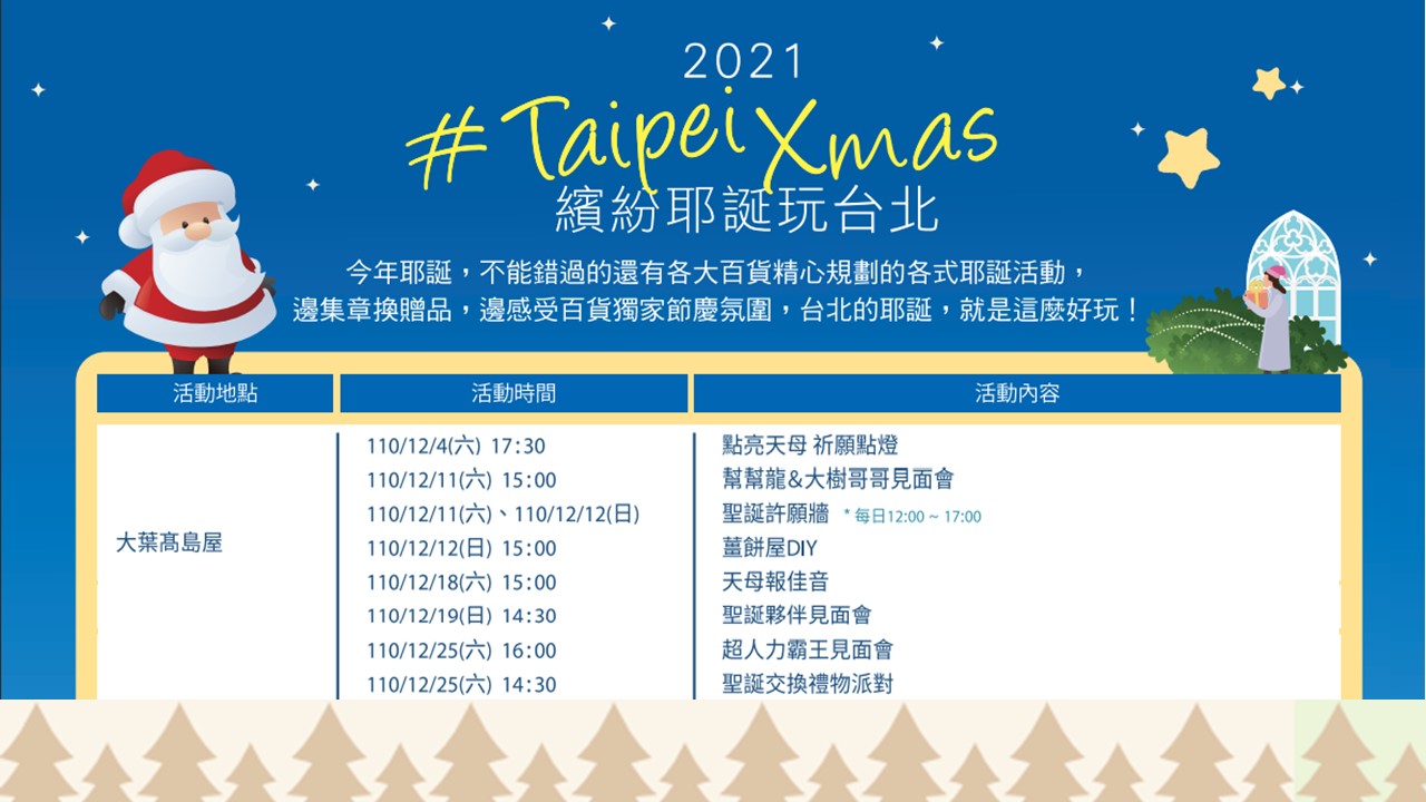由台北市商業處主辦「2021繽紛耶誕玩台北」活動,活動自11月19日至111年01月03日展開,今年活動包含29家百貨推出的音樂展演與聖誕活動、49處絕美聖誕燈飾打卡拍照,以及54家商家參與集章兌換耶誕好禮等三大亮點活動。